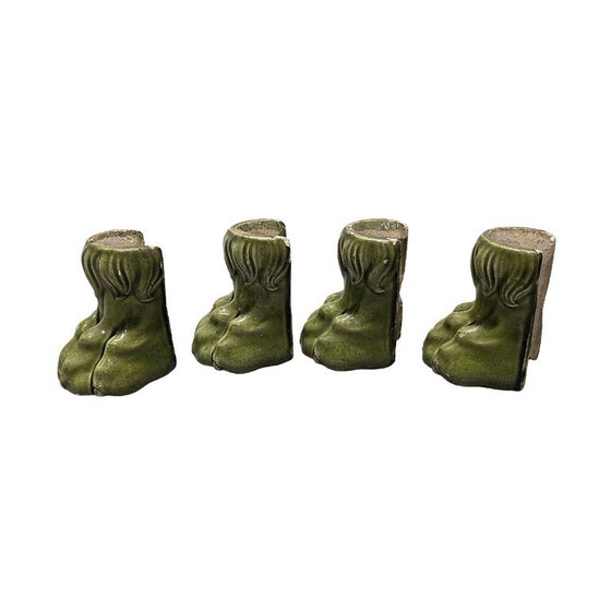 Antique green-glazed earthenware lion paws, dating from the second half of the 19th century. These beautiful and decorative ceramic paws, shaped like claws, were used for bathtubs or furniture. They are glazed green and feature details resembling a lion's paw or similar animal claw. They have small chips around the edges but are not cracked.