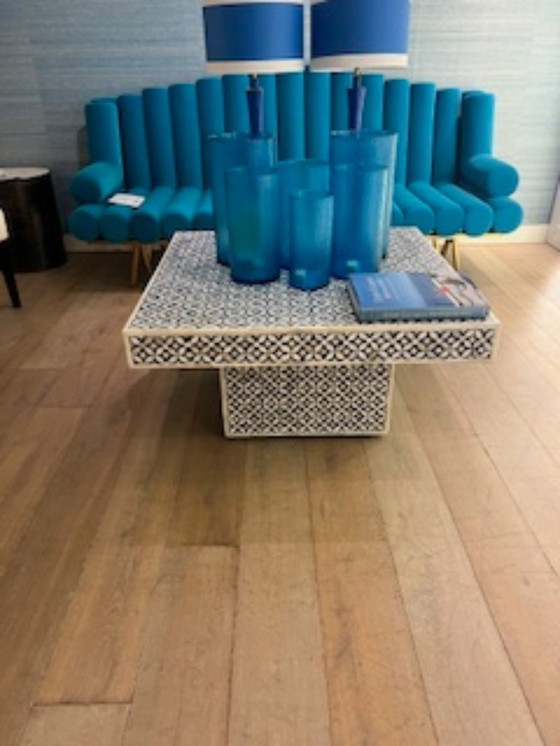 This beautiful coffee table from India is meticulously inlaid piece by piece (bone inlay) and is in excellent condition! The showroom model retailed for €1995. It fits into any interior, whether modern or classic, boho, or eclectic. It features beautiful panels in blue and white motifs. Sturdy construction. Dimensions: 90 x 90 cm, edge height: 10 cm, base height: 35 cm, total height: 45 cm.