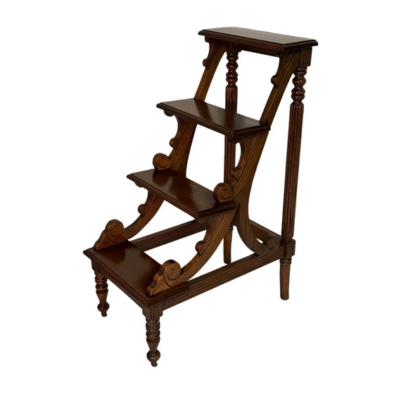This antique regency style stepladder is a great addition to any home. This piece is sturdy enough to support a grown man standing on it. It makes it ideal to reach those hard to reach places. Beautifully shaped library steps with carvings on all sides.
