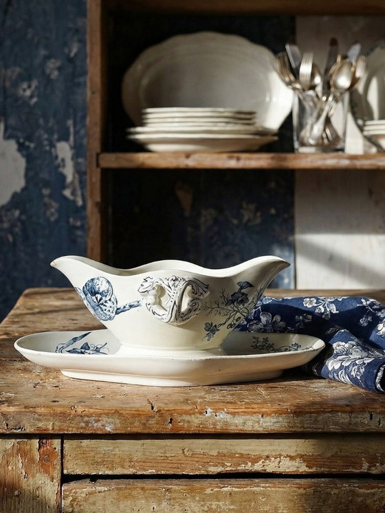 A lovely antique ironstone gravy boat from the Longwy factory, dating from the late 19th or early 20th century (1880-1910). It features an integrated saucer decorated in dark blue with flowers and plants, including bindweed, poppies, asparagus, sarsaparilla, and a pair of birds. The elegant shape is complemented by beautiful, hand-painted side handles adorned with stylized borders and foliage. It is stamped on the base with "Longwy" and the number RO 7.87.