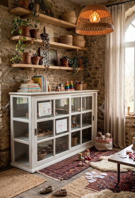 A vintage workbench, this charming low display cabinet is not a reproduction; it's an authentic piece with a history.