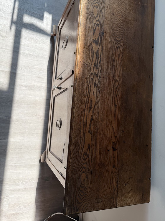 Sturdy solid oak sideboard with two drawers and two doors. Fitted with recessed panels and original hardware. Heavy and stable piece with normal signs of wear consistent with its age.