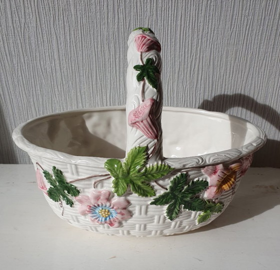 The basket is richly decorated with pink, white, and yellow flowers and green leaves. Despite its age, it is in excellent condition, with no chips or cracks in the glaze. A beautiful decorative piece for the enthusiast of antiques or Majolica.