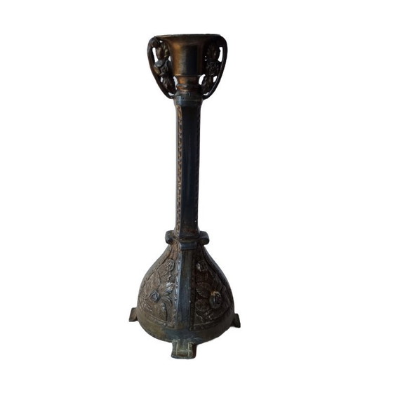 This antique metal candlestick is a beautiful example of European craftsmanship from the late 19th century. The candlestick is completely handcrafted and composed of different metals, creating a unique look with subtle color and material differences.