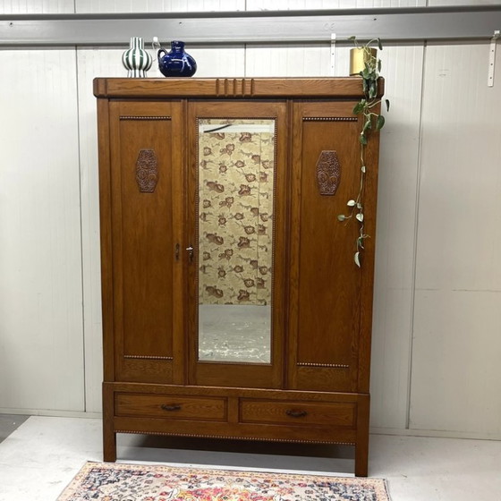 Beautiful antique demountable storage/wardrobe! The cabinet features fine details such as the woodcarving ornaments in the doors and the beaded panels along the sides. It has a mirrored door in the middle and a panel door on the left. The panel on the right is not a door and cannot be opened. There are 2 shelves behind the doors. For an additional charge of 25 euros, we can install a hanging rail; please indicate this when placing your order. There are 2 spacious drawers at the bottom. The cabinet has the original decorative metal hardware and can be locked (sometimes the lock needs an extra push :-)