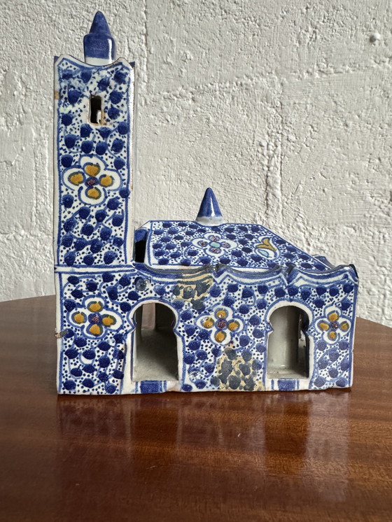 Rare and beautiful Moroccan ceramic illuminator's inkwell with blue decoration from Fez, dating from the first half of the 20th century. Shaped like a mosque, it features four integrated inkwells concealed beneath a removable, roof-shaped lid. Good overall condition (note some signs of age and use: see photos).