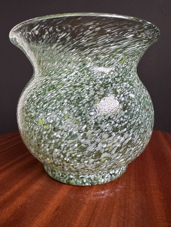 Beautiful small vintage "ball" vase (1950s/60s) in speckled Murano glass with a "confetti" pattern in shades of green; excellent condition