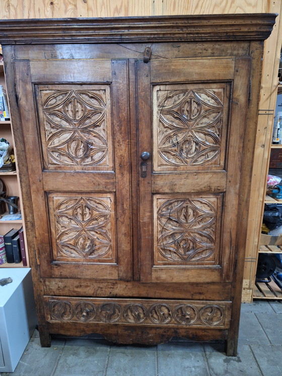 18th-century solid oak cabinet with two doors, two shelves, and a drawer at the bottom. The doors feature hand-woven panels with Gothic motifs.