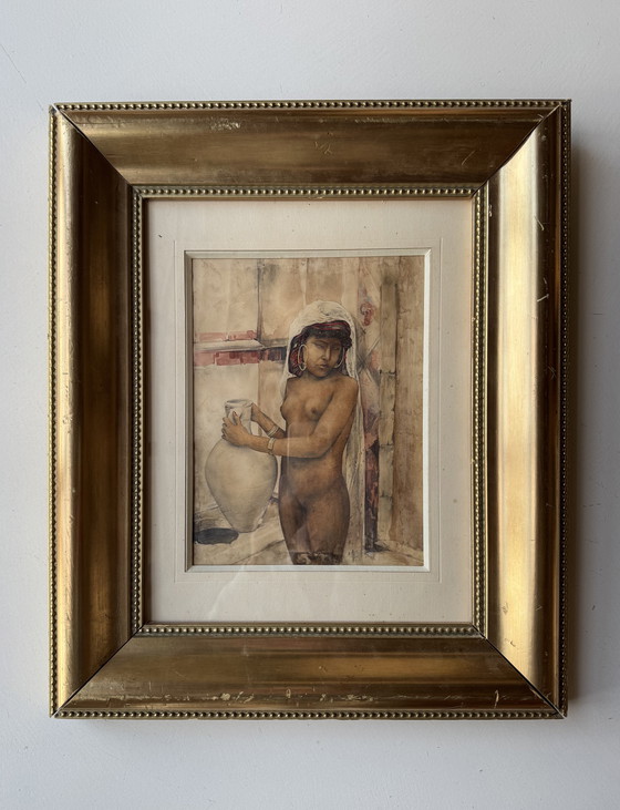 Superb Orientalist watercolor on paper, late 19th/early 20th century, depicting a nude woman with a jug; exquisite work in the shading of the skin, the detail, and the delicacy of the hands; good overall condition (some marks on the paper, more recent framing may need attention).