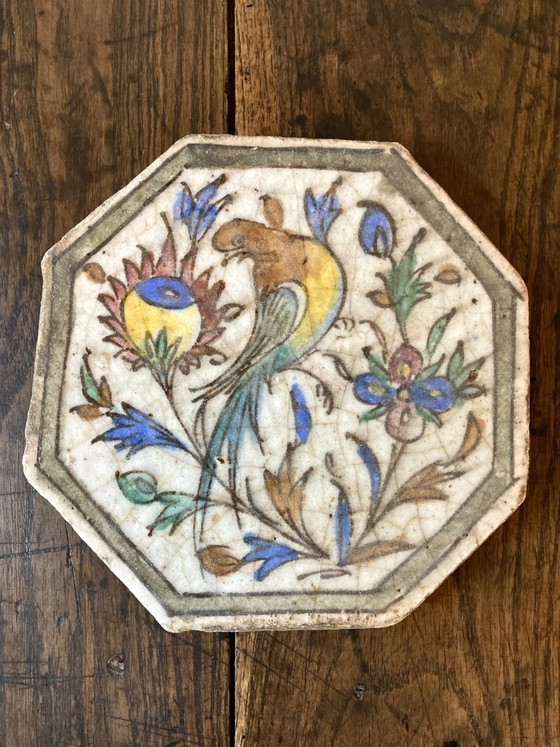 The palette—cobalt blue, green, yellow, and brown on a white background—is typical of Iranian productions of this period. The relatively rare octagonal shape likely originated from an earlier decorative architectural use.