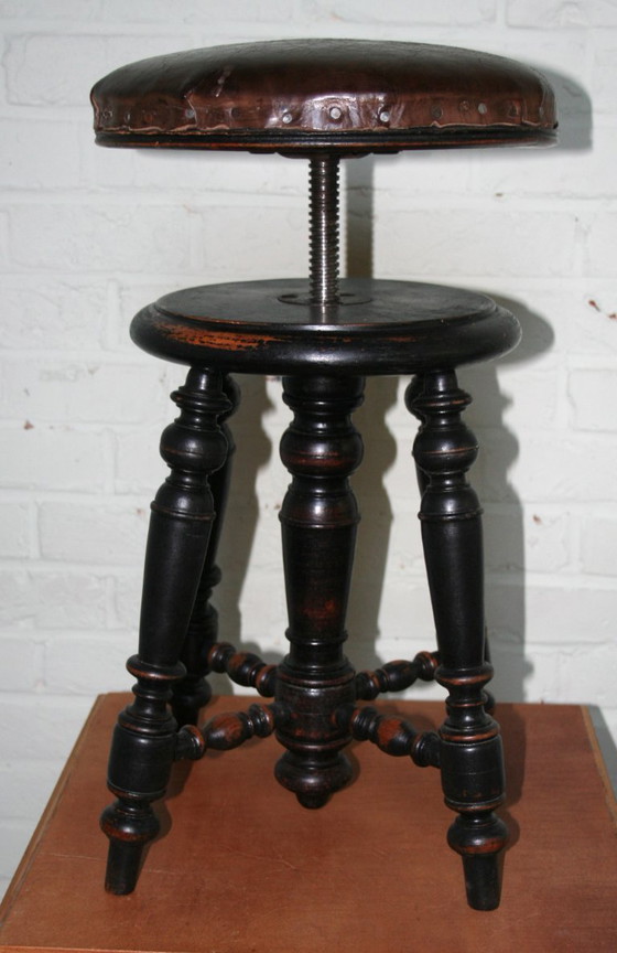 Antique piano stool from a music room. This piece is in original condition. It has its original upholstery of thick leather and a sturdy wood structure. It has undergone a gentle restoration, but with respect for the patina it has acquired over the years. It swivels effortlessly up and down from 49 cm to, for example, 60 cm. This piece comes from a music room. The seat has a diameter of 32 cm. A beautiful and stylish piece with a proven track record.