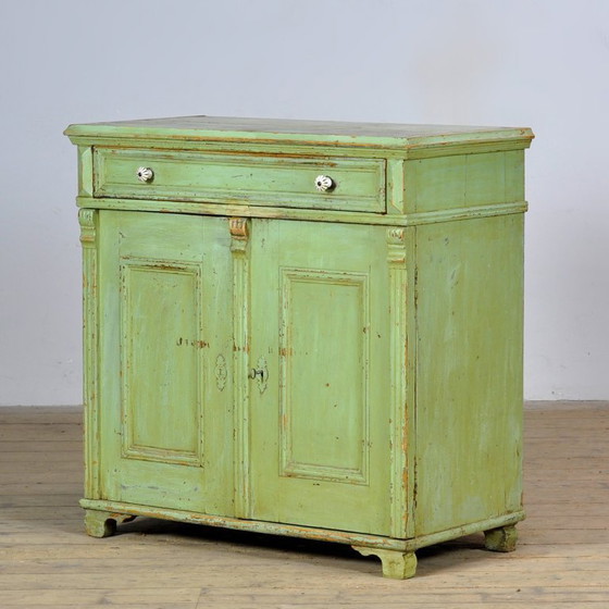 This charming sideboard, dating from around 1910, is for lovers of authentic furniture. The cabinet is in original condition, with the original paint displaying a beautiful patina. The lock works and the key is present. The cabinet has been cleaned and treated against woodworm, so it is ready for immediate use. With ample storage space, this is a practical and stylish piece of furniture.