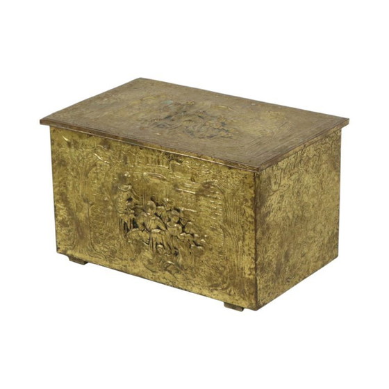 Large old repoussé chest made of pine wood and clad in brass. The chest features detailed relief images, depicting an old scene from daily life surrounded by trees and floral decoration on the sides. This chest was used as a coal bin or hearth chest to store logs, first half of the 20th century.