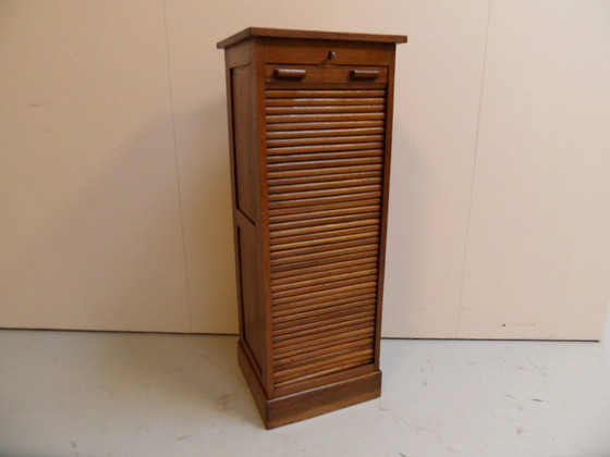 Antique oak roller shutter cabinet with beautiful oak drawers inside. Made around 1910-1920. With panels all around; can also be placed anywhere in a room!