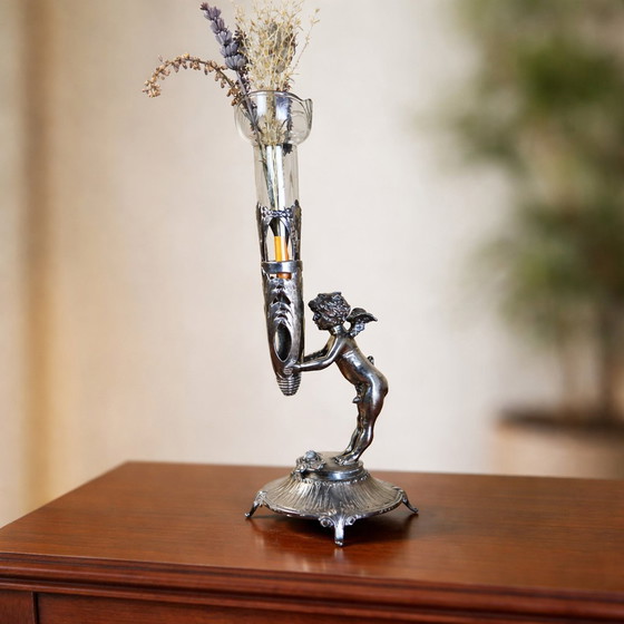 A unique antique silver-plated vase/bougeoir or candlestick from around 1900 with a puti/cherub/angel design. The cherub stands on an ornate base, with a rose resting at its feet. This beautiful object is Neo-Rococo in design (a revival of the Rococo style around 1900). The cherub holds a holder into which the beautifully crafted glass rests. 4377 (C5) is scratched under the base of the object; this is likely a production number. In short, a unique and romantic object for the true connoisseur.