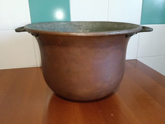 A splendid antique copper boiler (or caudaio), an authentic piece of rural tradition. This item stands out for its thick sheet metal and the robustness of its craftsmanship. Main features: Material: Solid copper with bronze handles. Tin-plated interior. Craftsmanship: Hand-hammered copper rivets and reinforced edge. Dimensions: Diameter 37 cm (with handles 45 cm) | Height 24 cm. Weight: approximately 4 kg (indicative of the excellent quality and thickness of the metal). Condition: Excellent patina, intact structure with no holes or dents. Interior with traces of original tin plating. Made in Italy. A piece of artisanal history, perfect for those seeking an authentic object rather than a modern reproduction.