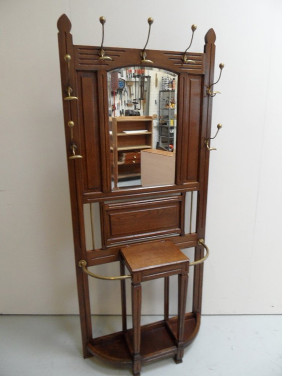 Antique oak standing coat rack with a facet-cut mirror and storage compartment. In very good condition. Made around 1900.