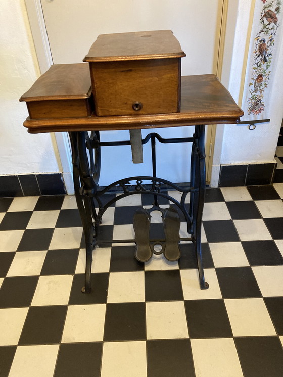 The unit exudes an authentic vintage charm and is perfect for lovers of antique sewing machines or as a decorative piece in a historic interior.