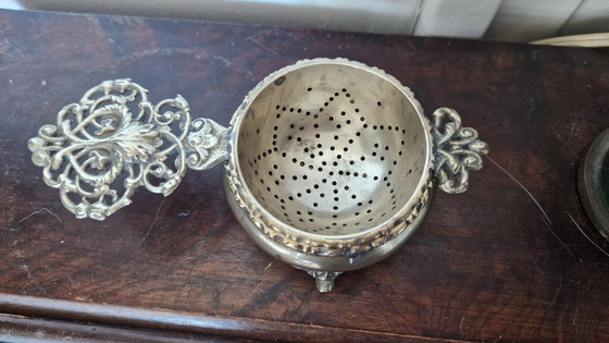 This antique tea strainer with drip tray exudes classic elegance and is a beautiful addition to your tea set. The refined design and detailed finish make it a striking piece for any table. Ideal for lovers of vintage and antique collections.