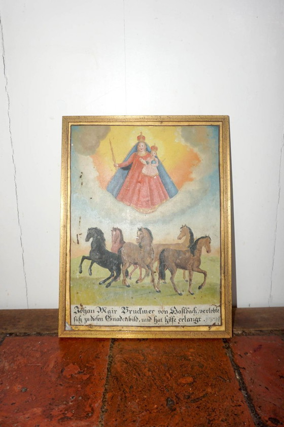 tags: antique votive, ex voto plaque, horses art, religious folk art, catholic devotion, 19th century art, folk painting, devotional votive, antique religious art, german folk art, equestrian art, outsider art, year of the horse