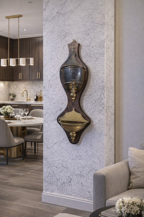 The upper basin features a lid and a perfectly integrated butterfly valve. It is topped with a cross decoration, suggesting its original use in religious settings (sacristies) or in noble homes of the period.