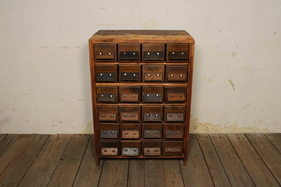 Such cabinets were traditionally used in pharmacies for storing herbs and substances, as well as in libraries and offices for archiving index cards.