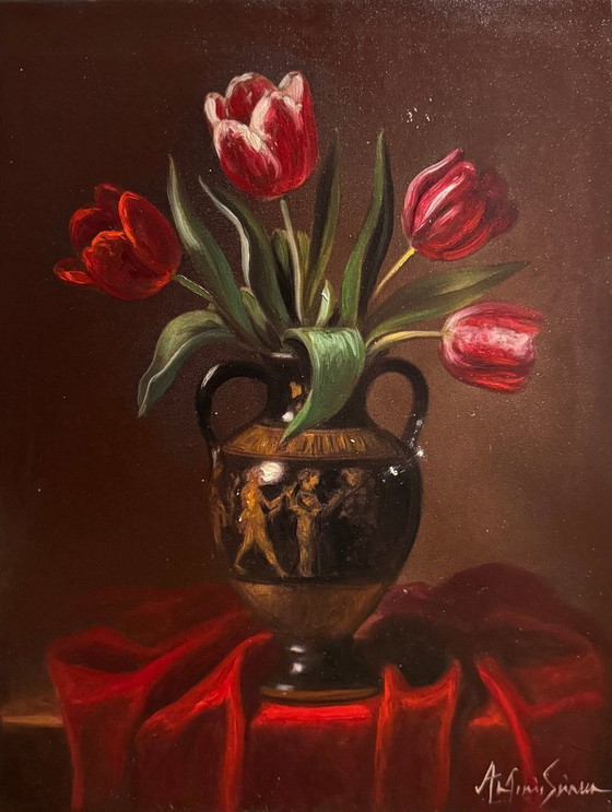 The amphora standing beneath the flowers bears classical figures in the style of ancient Greek pottery. This mythological reference anchors the composition in antiquity, making the vase more than a vessel. It becomes a guardian of transmitted stories. Above it stand the tulips as messengers of the current season, ephemeral and alive. The painting rests in this dialogue between myth and immediacy.