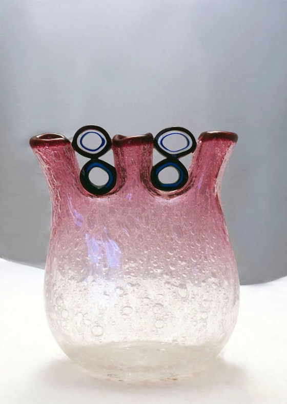 Made of shaded bubble glass with three spouts with applied glass paste and rings.