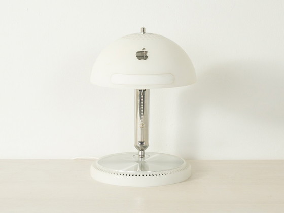 Iconic Apple iMac G4 from the 2000s, lovingly converted by us into an extraordinary table lamp. The original white plastic casing of the iMac has been preserved and transformed into a decorative design piece. Instead of the screen, the cover of the iMac base has been mounted and now serves as a distinctive lampshade. All technical components have been removed and new wiring with an E27 socket has been installed. A piece of nostalgia for your own home.