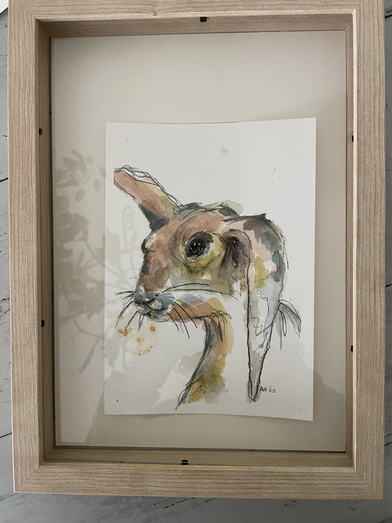 Bring a touch of whimsy and charm to your space with this delightful aquarel painting. Featuring a beautifully abstract depiction of a rabbit, this piece is a playful blend of colors and textures that will surely capture attention. Perfect for adding a splash of creativity to any room, it’s framed in a simple wooden frame that complements its artistic flair.