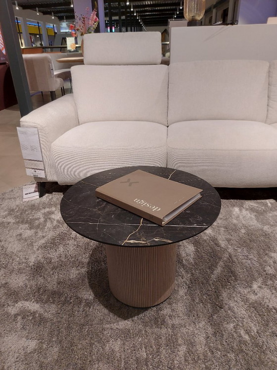 This ARAMON coffee table by XOOON is a showpiece for your living room. ARAMON has a diameter of 60 cm, is 45 cm high, and stands on a distinctive cylindrical base. The tabletop is made of durable HPL with a black marble look. Would you prefer a slightly larger coffee table?