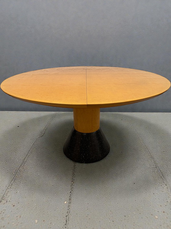 The Balance is a practical round table with a timeless design. The Balance can be used as both a dining table and a conference table. This designer table has a round top supported by a robust column. This design ensures ample legroom under the table. Diameter: 130 cm. With the intermediate top, the table is 190 cm wide. Height: 73 cm. This Balance table has both the column and the top made of maple wood.