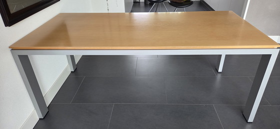 Beautiful ARCO design table with a minimalist design. The tabletop is made of beech wood (slightly damaged) and the base is metal. The table is in good condition and perfect for cozy evenings in good company. Suitable for various purposes, such as a dining table or desk.