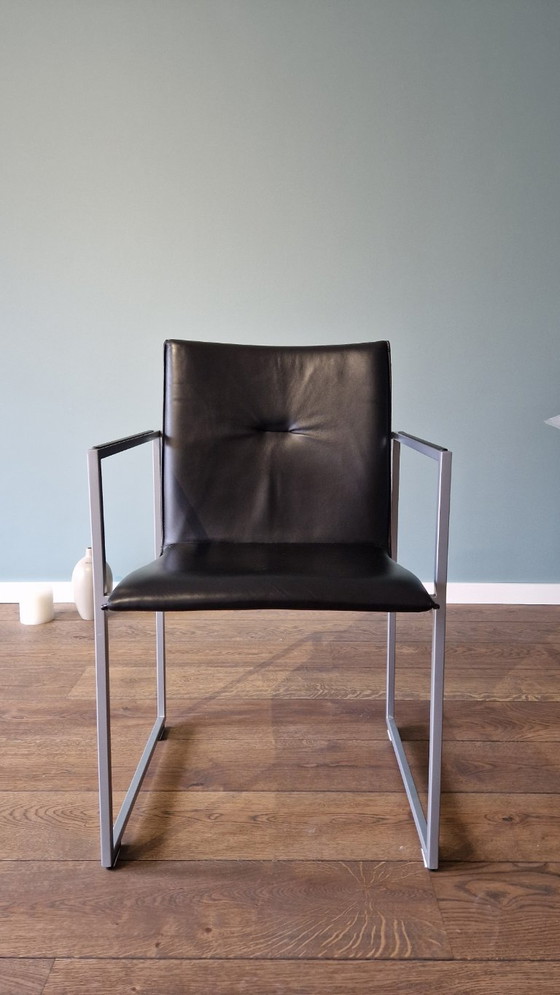 Set of 4 Arco Frame chairs in black leather, designed by Burkard Vogtherr (2000). These modern chairs combine sleek design with comfort. The metal frame provides a sturdy base, while the leather upholstery creates a luxurious look. Perfect for a contemporary dining room or office. The original retail price was €1019 each.