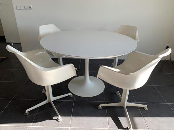 Arkana dining set, featuring four white bucket chairs paired with a sleek round table. This set embodies the timeless appeal of Mid-Century Modern design (1970s).