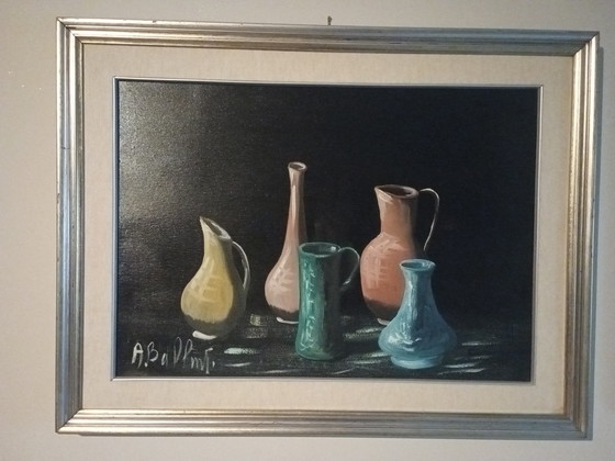 Immerse yourself in the timeless elegance of this original painting by Armando Ballanti, a work that captures the beauty of simplicity through a composition of vases in delicate hues. The canvas, measuring 70x50 cm, is carefully framed in a wooden frame, bringing the overall dimensions to 86x65 cm.