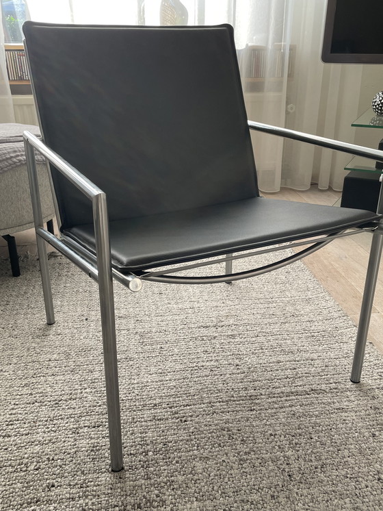This is the Armchair SZ 03 Ohman 1012-1000, designed by Martin Visser for Spectrum. The chair has a sleek modern design with a black leather seat and a sturdy metal frame. The minimalist aesthetic of the chair makes it a perfect addition to contemporary interiors. The comfortable seat and durable materials ensure both style and durability. Chair has not been used, no creasing in the leather, smoke and pet free home. Sits very comfortable due to the special suspension system. Absolutely undamaged. Seat height 44 cm.