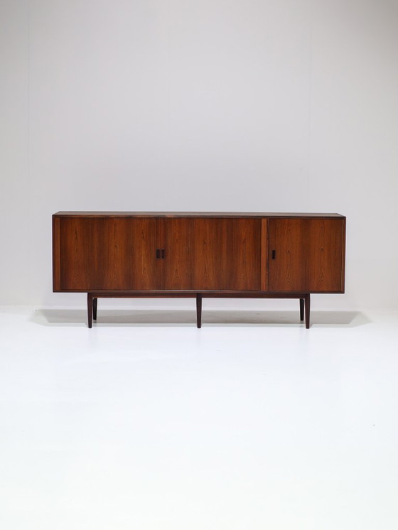 Rare high-end sideboard, model OS 36, designed by Arne Vodder for Sibast Møbler in Denmark around 1960. This sideboard is made of rosewood with a beautiful grain. The grain flows seamlessly onto the two long tambour doors, which also roll away very smoothly. Exceptional craftsmanship! The sideboard features height-adjustable shelves and drawers. On the right is a bar area, which can be used for bottles and glassware. Every detail is beautifully and delicately crafted, with subtle organic shapes. An extremely timeless, elegant, and minimalist piece of furniture of the highest quality.