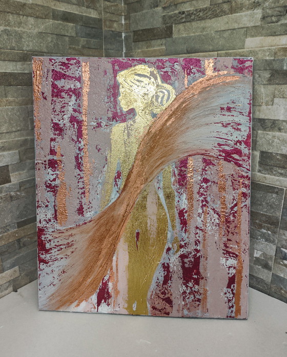 In quest'opera della linea Pure Zen, la figura eterea emerge dalle trame dense e terrene (le esperienze, il mondo materiale), avvolta da un drappeggio in rame e oro rosa – il "Velo". Questo velo non nasconde; al contrario, è la manifestazione transitoria che avvolge o svela l'essenza più pura.