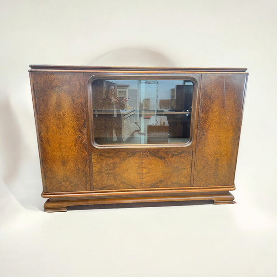 The condition is very good and there are only a few signs of age in the veneer. Unfortunately, the two sliding glass doors have a chip.