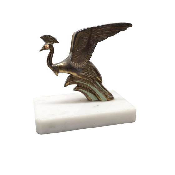 Art Deco peacock bookend from France, 1930s. Metal alloy with original paint details on a marble base. Elegant and collectible design object. In good condition.