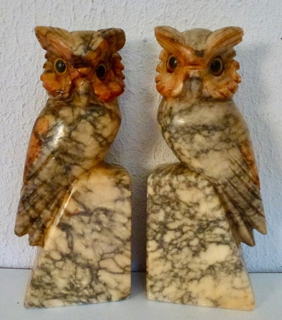 This is a pair of Art Deco bookends with seated owls, made of Italian alabaster.