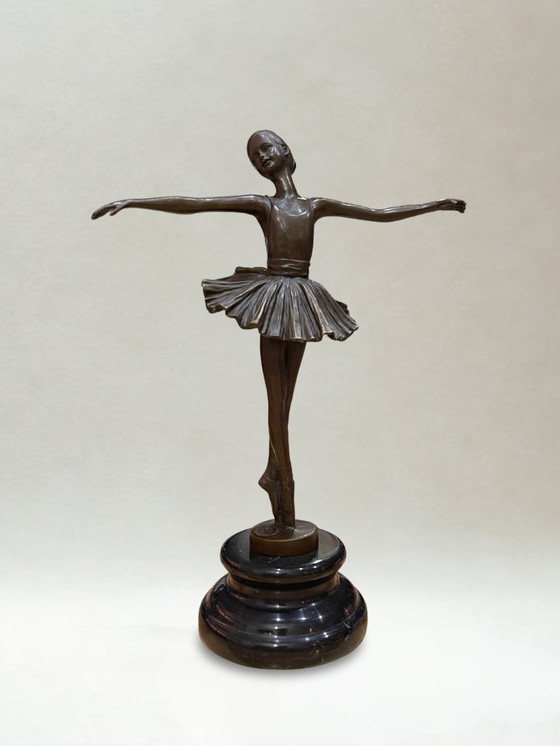An elegant Art Deco sculpture depicting a ballerina in a classical pose, arms outstretched, perfectly capturing the movement and lightness of her gesture.