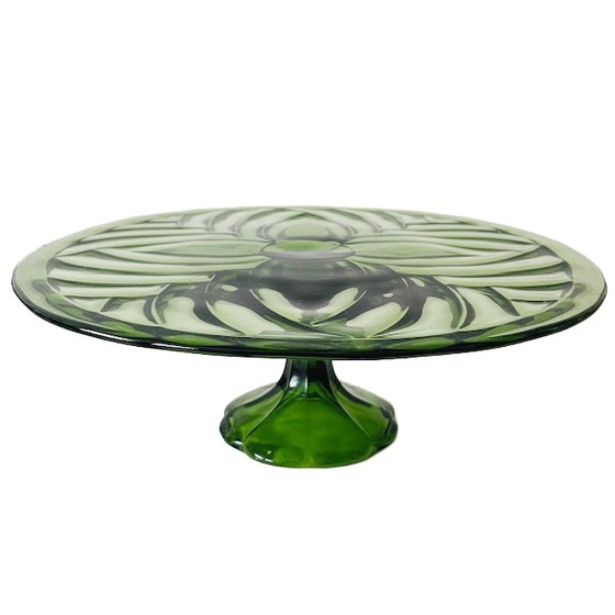 Pressed green crystal glass from the 1930s. This glass serving dish has a diameter of 34.8 cm and is 11.2 cm high. There are some bubbles in the glass. This is normal, as they form during the cooling process. The glass cake stand is in good vintage condition, with a small chip on the rim (approximately 1 mm, see photo).