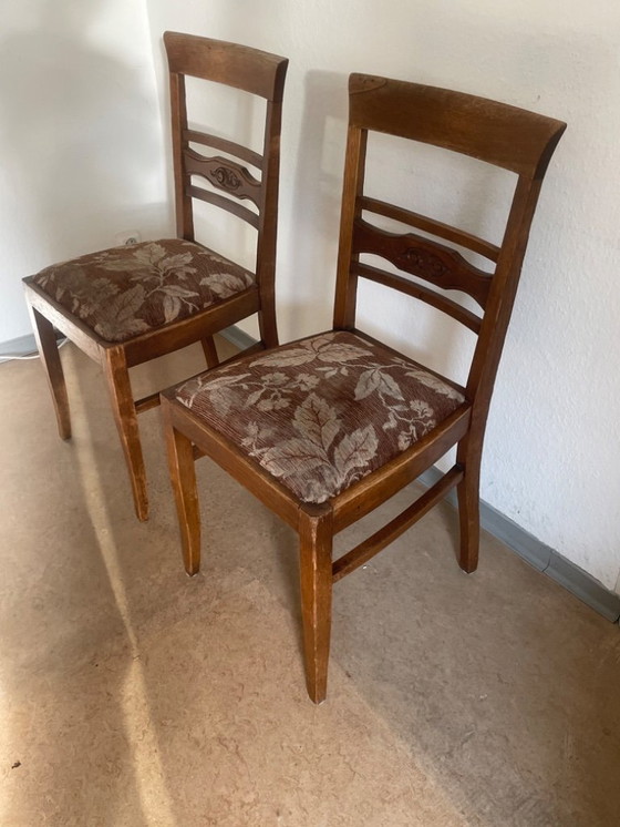 Very beautiful Art Deco chairs with the typical mix of austerity, playfulness and curves in their design. They ground every room with their gentle harmony and earthy, natural colors, a wonderful counterpoint to furniture from our fast-moving times. The upholstery is worn at the front, but this does not detract from the charm of the chairs. An upper corner of one of the two pieces has been professionally glued so that it is hardly noticeable.