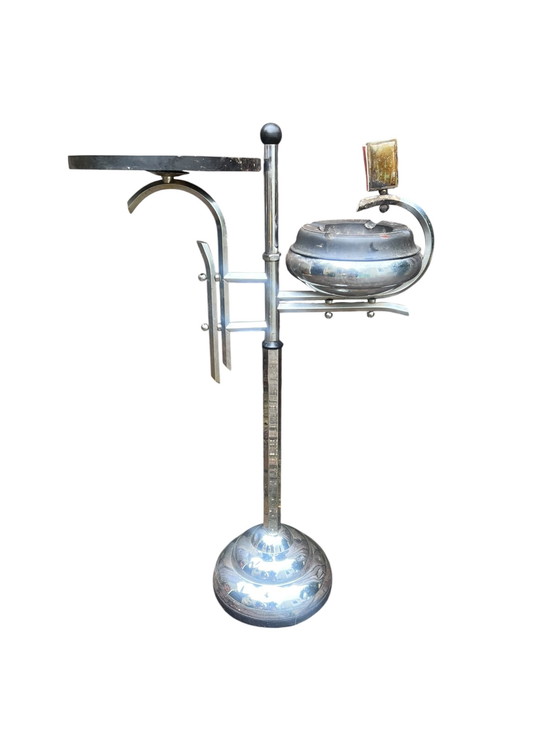 Step back into the elegance of the 1930s with this exquisite Art Deco ashtray stand by Demeyere. Crafted with a harmonious blend of chrome and bakelite, this piece embodies the sleek and sophisticated design synonymous with the Art Deco era. Its polished chrome finish and distinctive geometric lines make it a striking addition to any interior, offering both functionality and timeless style.