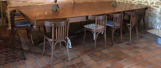 This characterful Art Deco table was used for many years as a council table. Then it has long served as a dining table that can easily seat 16 people. The table has traces of use but is in good condition considering its age of about 100 years.