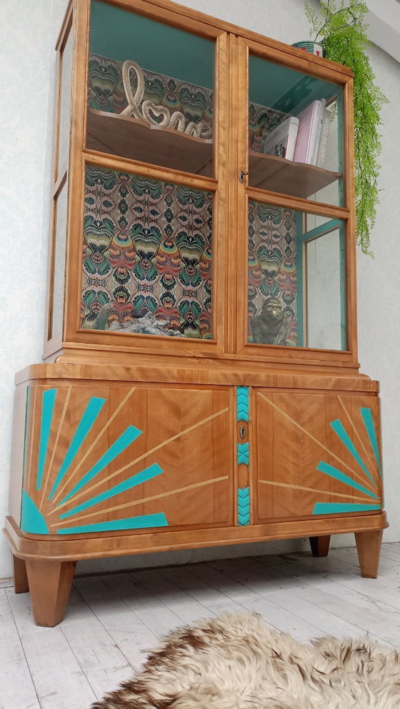 The display cabinet is one piece. The pattern on the back wall is by London designer Mary Katrantzou. The window frames inside are painted gold and the rest of the interior is turquoise. On the lower part typical Art Deco sun rays in turquoise with gold rays in between. There is a second shelf.