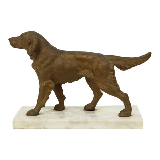 Nice figurine of a dog standing on a rectangular marble base; the sculpture is made of a zinc alloy, popularly known as zamak, gold-colored to resemble bronze, Art Deco period, circa 1930s-1940s.