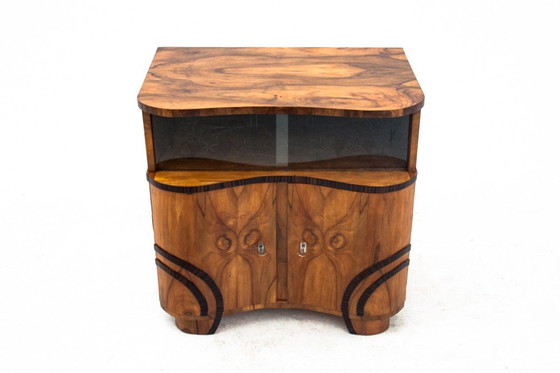 Upper part of the chest of drawers with glass sliding doors. Lower part with a lockable door, one shelf inside. The whole veneered with richly grained walnut.